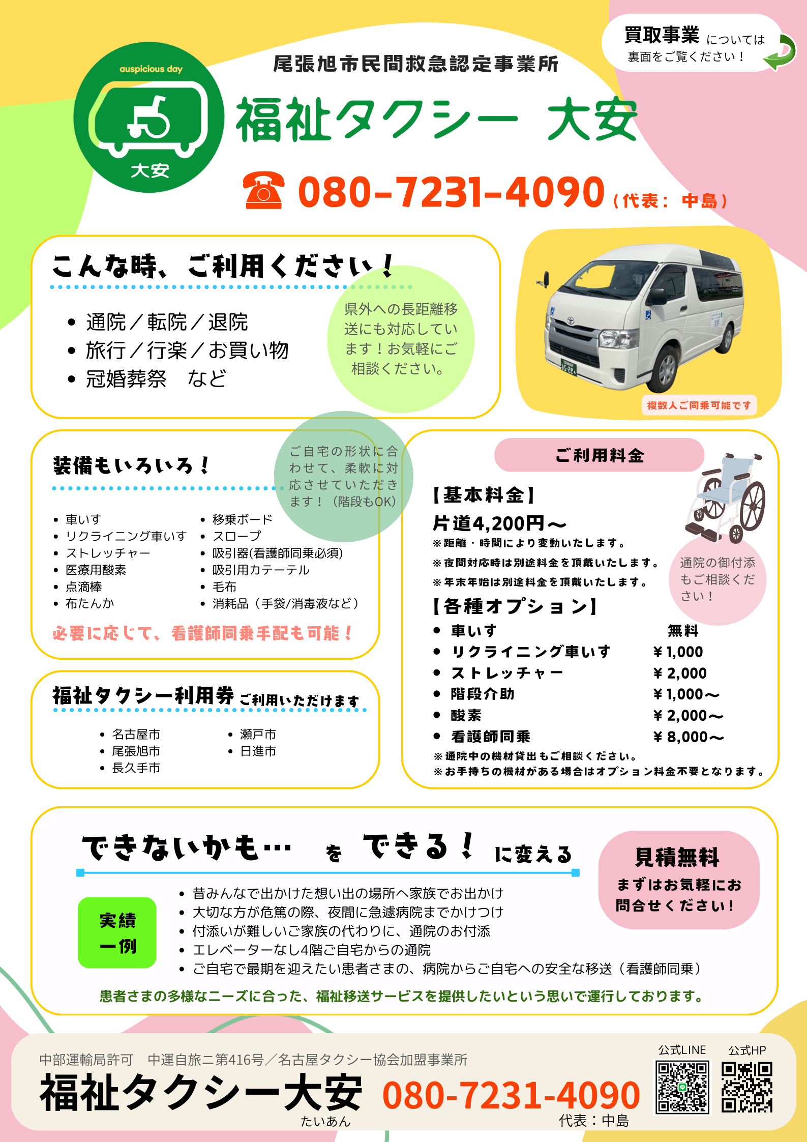 福祉タクシー大安は福祉輸送専門のタクシー事業者です!要支援・要介護の方や車いす、ストレッチャーを使用した御移送を専門に運行致しております。事業所は尾張旭市です。尾張旭市・名古屋市・瀬戸市・長久手市・日進市・春日井市などで主に運行しております。是非お問合せください(^^)